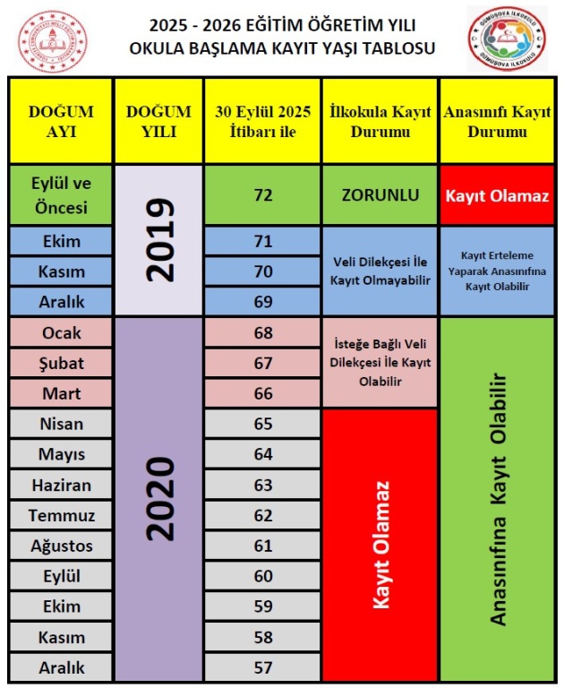 (İlkokulların birinci sınıfına, kayıtların yapıldığı yılın Eylül ayı sonu itibarıyla 69 ayını dolduran çocukların kaydı yapılır. Okul müdürlükleri, yaşça kayıt hakkını elde eden çocuklardan 69, 70 ve 71 aylık olanları, velisinin vereceği dilekçe ile okul öncesi eğitime yönlendirebilir veya kayıtlarını bir yıl erteleyebilir.)